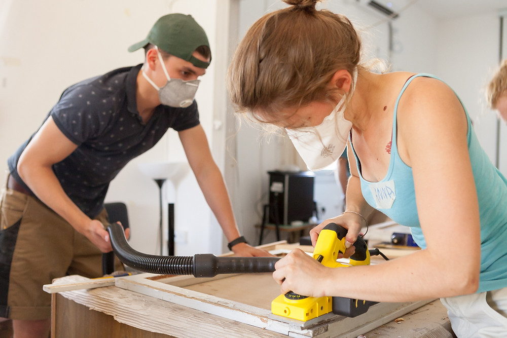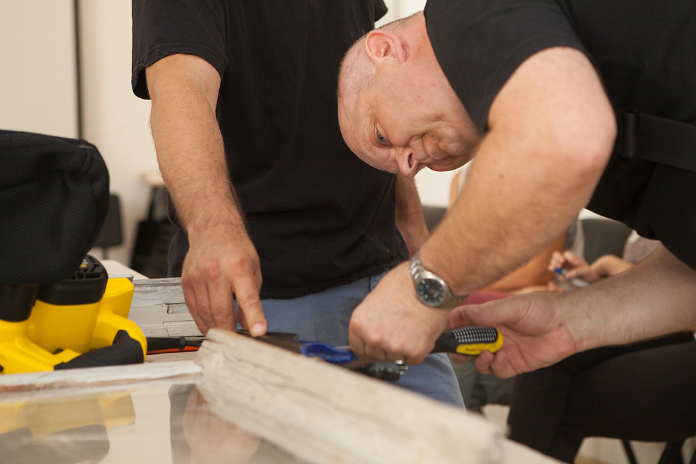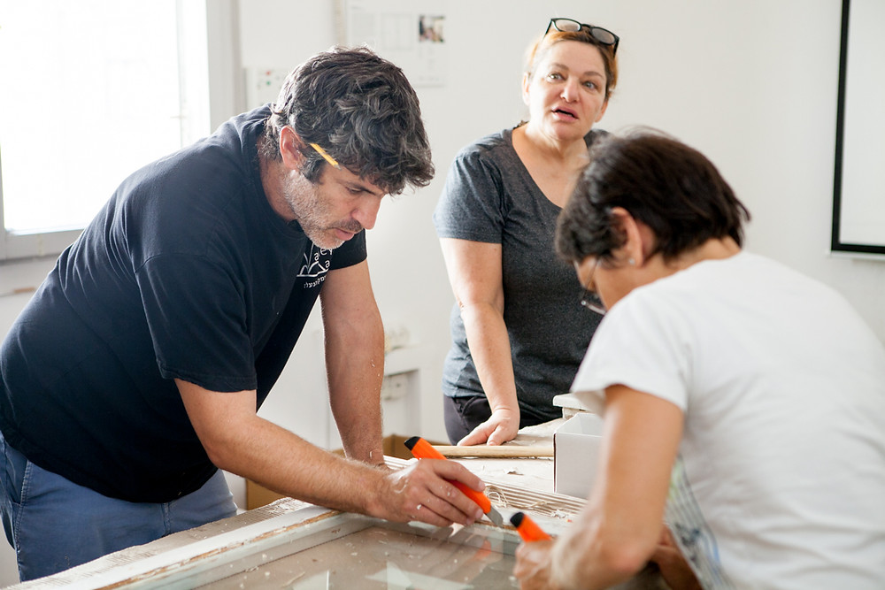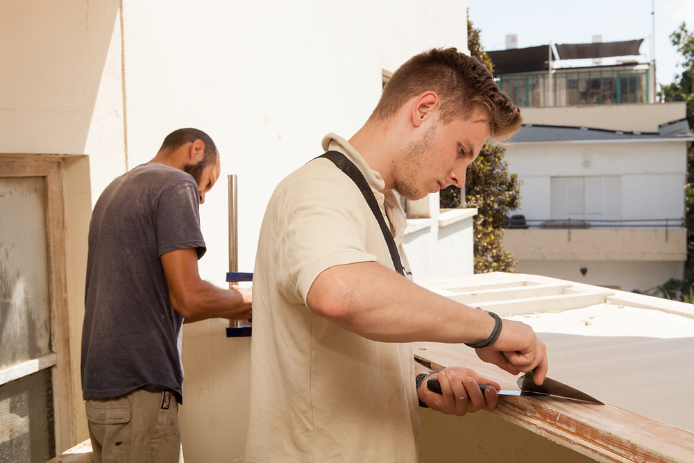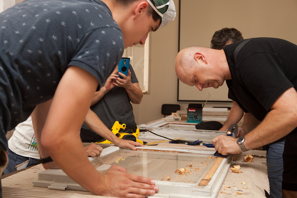 In August 2017, we hosted a woodwork renovation and preservation workshop, the first-of-its-kind in Israel. The workshop was led by architect Robert K. Huber, manager of zukunftsgeraeusche GbR (in scientific partnership with the Technical University of Berlin) and Frank Schulze, a German master carpenter from the Vocational Advancement Service of the Association of Construction Industry of Berlin-Brandenburg. About 20 participants learned how to repair and renovate 80-years old windows and balcony doors, instead of replacing them with new ones. The three weeks workshop was attended by both Israelis and Germans, and together they filed, peeled, uncovered the historical secrets of the wood (and a few woodworms), painted and re-glazed. Participants included architects, conservation students and amateur and professional carpenters from Israel, as well as German apprentices in carpentry undergoing vocational training at the Berlin Knobelsdorff-School. The workshop fostered also the dialogue between the Israeli and German participants in social activities beside the work, accompanied by the Berlin Bildungsverein Bautechnik. We spoke with some of the participants, got to know them better and heard how they feel about wood, carpentry and the Max Liebling House. Nice to meet you!