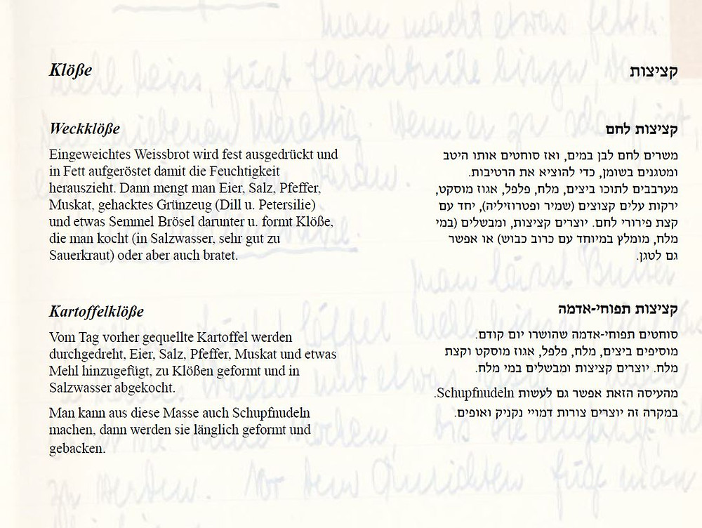 With its Jewish-German phrases and traditional illustrations, the book is a valuable example of cultural, family, and collective history. In a time of numerous cooking shows and excessive discussion of gourmet food and celebrity chefs, browsing it brings back a heartwarming feeling of nostalgia mixed with practical corporeality. The concise, practical tone, the frugal ingredients, and the brief instructions reframe the task of food preparation in its former context: feeding a family.