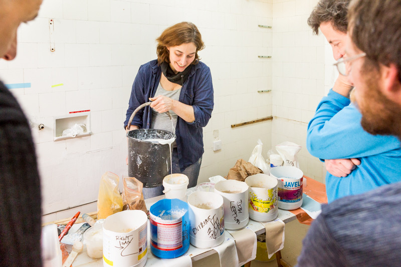The myth of how white was the White City is once again shattered! This time into pieces of different pigments. As it turns out, apartments built in the 1930s were actually adorned with richly colorful walls designed to create an atmosphere in the rooms. As part of the paint workshop we held last week at the Center with German and Israeli experts, we studied the various colors and prepared a unique mixture of paint based on the original Yekke formula used in the previous century, giving each wall an individual character. We are excited to share the recipe with you: buttermilk (you can use either Leben or 3% fat Gil, whichever you prefer), hydrated lime, water, and pigments.